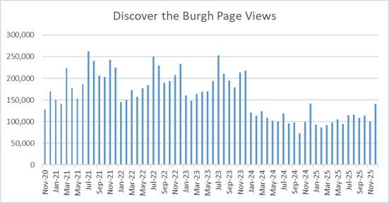 Our Q4 on Discover the Burgh was, ironically, almost a perfect match for 2024. We saw a nice uptick in traffic from November to December, which, while more or less identical to last year, still hit our target of breaking 100,000 pageviews for the month.